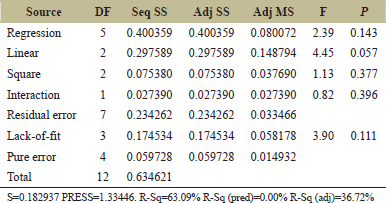 ![]() | Table 6: Analysis of Variance for Response Surface Methodology (RSM). [Click here to view] |