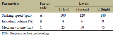 RSM is a combination of mathematical and statistical techniques through which we can determine the optimum experimental conditions using Box–Behnken design [38,39]. The effect of medium volume, inoculum volume, and shaking speed was studied using RSM by Box–Behnken design [Tables 8 and 9]. From Tables 8 and 9, the model F value 5.82 and P value 0.033 were found significant. The model equation is significant since P < 0.05 was considered.