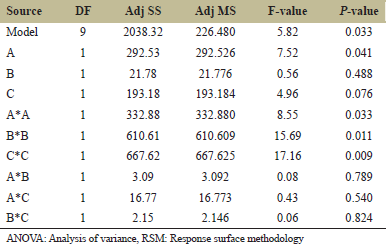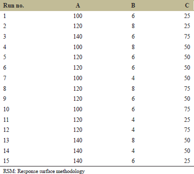 ![]() | Table 3: Optimization study parameters for RSM from low to high level. [Click here to view] |