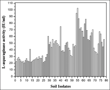 Asparaginase producing bacterial strains were isolated using modified M9 media. Enzyme producing ability of isolated strain after primary screening is presented in Figure 1. A total of 78 microorganisms were found as asparaginase producers. This observation is in concord with the work of Gulati et al. [18], wherein it was depicted that the change in color from orange to red was because of asparaginase production. Isolate no.-55 from soil sample 4 was observed to be the highest asparaginase producer and secondary screening revealed extracellular enzyme production of 102.61 IU/mL. Kamble and Khade [22] showed that Bacillus subtilis is a potent asparaginase producer. The enzyme production by the selected bacterial strain is considerably higher as compared to 23.8 IU/mL reported by Pradhan et al. [20] and his associates and 47 IU/mL reported by Sanghvi et al. [23]. Streptomyces ginsengisoli produces an optimum enzyme activity of 3.32 IU/mL [24] and Trichosporon asahii IBBLA1 yielded 20.57 IU/mL [25].