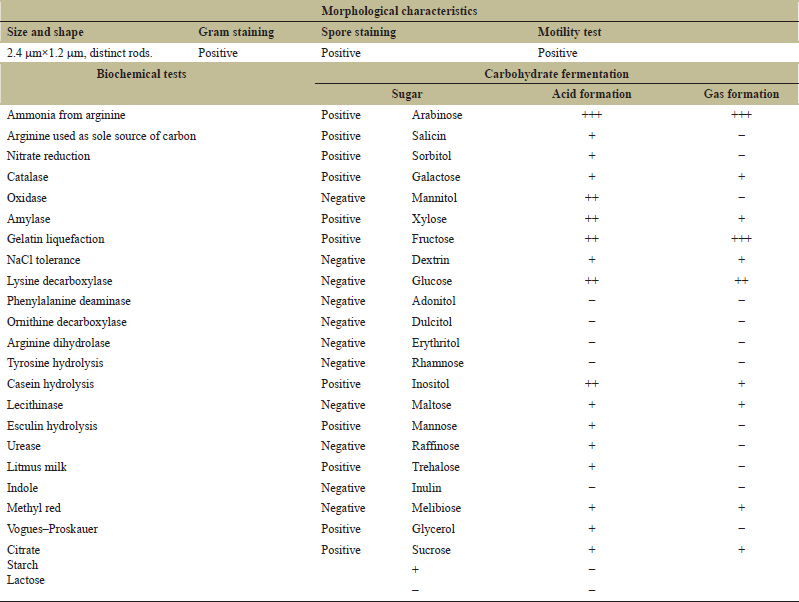 This isolated organism was identified by various morphological, biochemical, and physiological tests as per Bergey’s Manual of Determinative Bacteriology [26]. Similar studies were also performed by Audipudi et al. [27] using mangrove soil. The characteristics are summarized in Table 5.