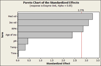 PB design was performed in the present study considering seven operating conditions (media volume, inoculum volume, age of inoculum, pH, temperature, fermentation time, and shaking speed). The effect of seven parameters gave 12 runs using PB design [Tables 6 and 7]. P < 0.05 is considered as statistically significant. From Tables 6 to 7, the significant parameters were medium volume, inoculum volume, and shaking speed. The Pareto chart displays the significant experimental parameters for enzyme production. It reflects the standardized effect of individual or the combination of parameters [Figure 4].