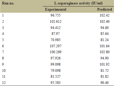 Y is the experimental response (enzyme production) and the coefficients indicate the effect of the parameters on asparaginase production. The R2 value is the indicator of variability in the experimental output. In this case, the R-square value was found to be 89.57% for the asparaginase production.