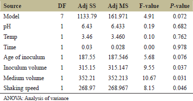 PB design is an effective technique for selection of the significant parameters among large number of operating parameters that impact fermentation process using minimum experimental trials. The seven operating parameters selected for fermentation process were media volume, inoculum volume, age of inoculum, shaking speed, pH, temperature, and fermentation time. Twelve experimental runs were performed to identify the significant parameters. The enzyme production (IU/mL) is known as response [Tables 1 and 2].