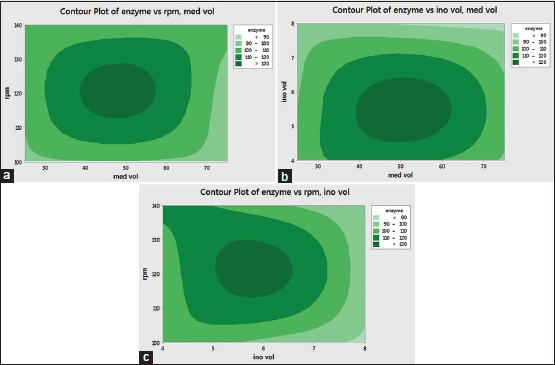 R2 value was found to be 91.29%. It indicates that there is a good agreement between the experimental and the predicted values. The interaction between the shaking speed and medium volume [Figure 5a] shows that at shaking speed from 112 to 126 rpm and medium volume 40–58 mL, the interaction was reported significant. The interaction between the inoculum volume 4.5–6.2% and medium volume 40–60 mL also indicates significant interaction [Figure 5b]. Furthermore, the interaction between shaking speed 115–126 rpm and inoculum volume 5.2–6.5 % is significant [Figure 5c]. The optimum condition of response analyzed using response optimization for the enzyme production was obtained at medium volume = 50 mL; inoculum volume = 6%; and shaking speed = 120 rpm.