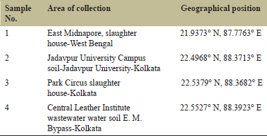 Potent bacterial strain was isolated from various soil samples collected from places adjacent to Kolkata and their respective locations are mentioned below: