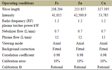 ![]() | Table 1: The operating conditions for the determination of iron, zinc, and copper ions using ICP-OES. [Click here to view] |
