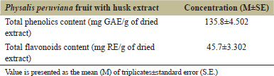 ![]() | Table 2: Total phenolics and flavonoids contents in Physalis peruviana fruit with husk extract. [Click here to view] |