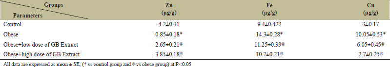 Table 5 demonstrates the alterations in trace elements in adipose tissue of control and obese rats. A significant overload and elevation in Fe and copper levels correlated with a substantial reduction in the Zn level in adipose tissue. Oral administration of a low or high GB dose significantly decreased Fe and Cu while concurrently increasing Zn.