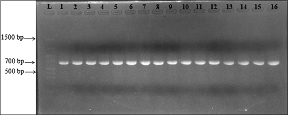 ![]() | Figure 2: Gel electrophoresis of PCR products of 16S rRNA gene. (L: 1500bp ladder; 1: B4X0T2.1; 2: B4X0T2.2; 3: B4X0T2.3; 4: V4.1; 5: B4XCT1.1; 6: B4XCT1.2; 7: V4.2; 8: B4XCT1.2; 9: B4XCT1.5; 10: V4.3; 11: B3XD2; 12: V4.6; 13: B3DX4; 14: V4.7; 15: B3XD1; 16: V4.10). [Click here to view] |