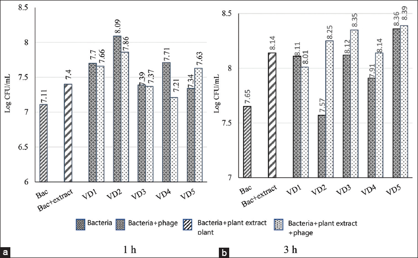 The ability of the extract and phage to inhibit the growth of V. parahaemolyticus B4XT4 and V. parahaemolyticus B4X0T2.2 was different [Figure 4] after four treatments incubated at 1 h and 3 h. The number of colonies when adding extracts or phages both increased the number of bacteria compared to certificates. For V. parahaemolyticus B4XT4, when combining the phage and extract, the inhibitory effect on bacterial growth was more obvious with only the extract (the value decreased from 7.71 to 7.21 Log CFU/mL). For V. parahaemolyticus B4X0T2.2, it was the opposite, as adding the extract activated its growth. The study which was combined phage and P. amarus extract to inhibit the growth of V. parahaemolytiucs; however, initially there was no effect.