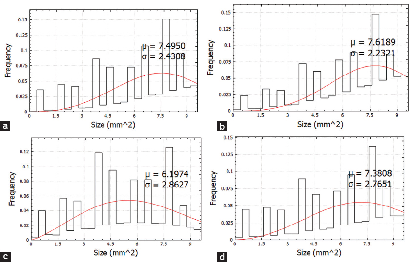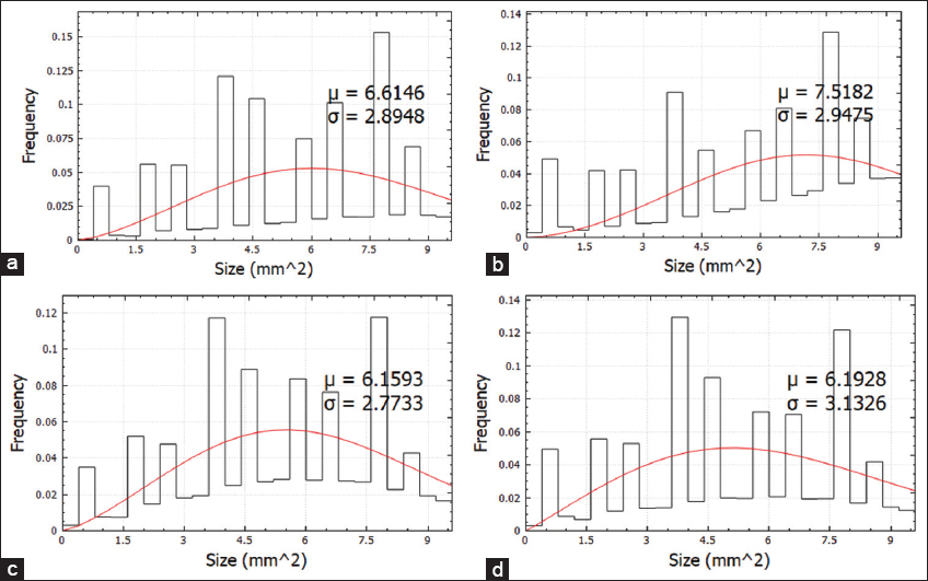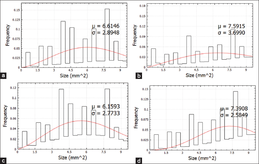 Both strains of V. parahaemolyticus (B4XT4 and B4X0T2.2) were affected by the extract P. amarus, which changed the colony’s phenotype. The extract affected the shape of colonies — it caused the edge of V. parahaemolyticus B4X0T2.2 shrink and dentate with sharp and small peaks, compared to the round colonies of the control [Figure 5a and b]. The cover of the colonies was toothed, and lobate margins arose for B4XT4 [Figure 5c and d]. With regard to the colonies of V. parahaemolyticus B4X0T2.2, the size is smaller but insignificant. The most significant change in colony size was observed during a sharp decrease of 4 mm2 and 4.5 mm2, which was a drop of 1.3 times and 3.0 times, respectively [Figure 6a and b]. The decline in colony size apparently occurred in V. parahaemolyticus B4XT4; indeed, a size of 6 mm2 và 6.5 mm2 is notable, with a drop of 1.2 times and 1.1 times, respectively [Figure 6c and d].