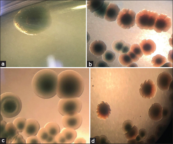 ![]() | Figure 5: Effect of plant extract on colonies of Vibrio parahaemolyticus B4XT4 and B4X0T2.2. (a) B4XT4; (b) B4XT4+ plant extract; (c) B4X0T2.2; (d) B4X0T2.2+ plant extract. [Click here to view] |