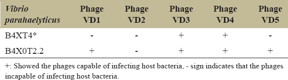 +: Showed the phages capable of infecting host bacteria, - sign indicates that the phages incapable of infecting host bacteria.