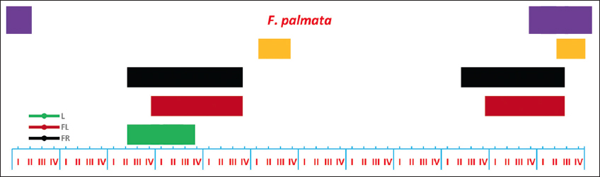 The leaf initiation in F. palmata started in the 3rd week of March and was complete by the 3rd week of April. Flowering and fruiting occurred 2 times a year 1st-time, fruits were visible between the 3rd week of March and the 3rd week of May, and a 2nd time between the 3rd week of October and the 2nd week of December. Seed dispersal also occurred 2 times in a year, and the period of seed dispersal in both seasons was short. The leaf fall started in the 1st week of December and was completed by the 1st week of January [Figure 1].