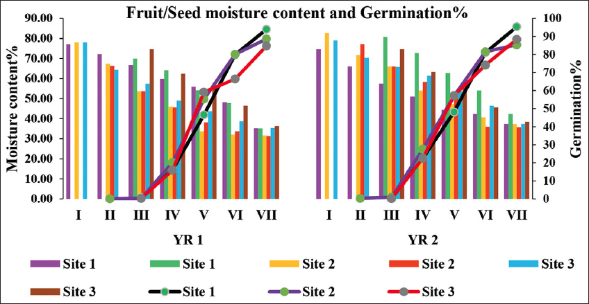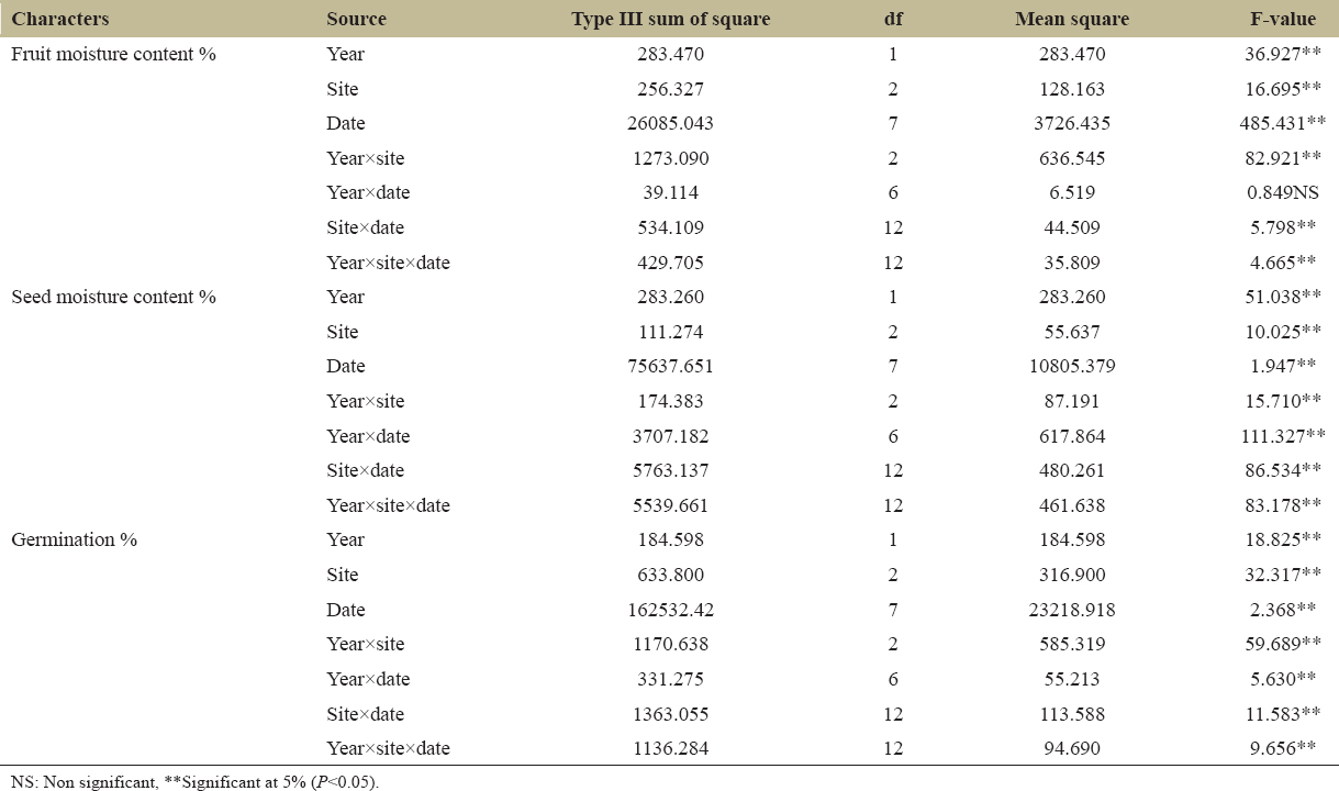 ANOVA showed that fruit and seed moisture content varied significantly across years, sites and dates (P < 0.05). The interaction between site × date, year × site, and year × site × date was significant for moisture content and germination of fruit and seed (P < 0.05) [Table 6].