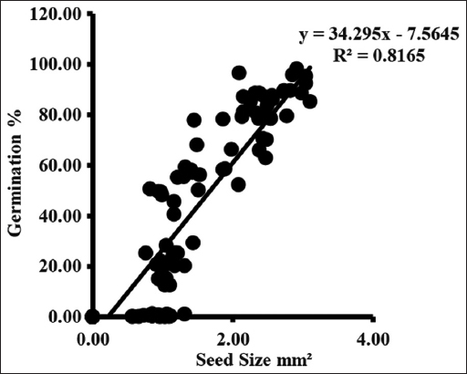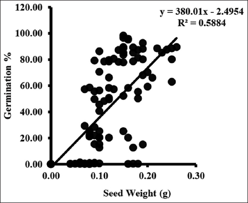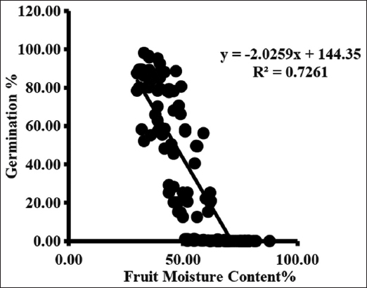 Germination started from the third collection and varied from 0.09 ± 0.02 to 0.69 ± 0.30%. Germination rate increases with each collection and maximum germination occurred in seed of final collection. Maximum germination ranged between 84.68 ± 2.42 and 95.33 ± 1.64% when seed moisture content was between 36.33 ± 0.88 and 42.33 ± 0.88% [Figure 3].