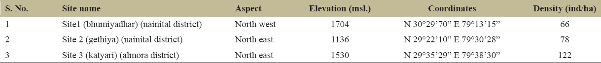 | S. No. | Site name | Aspect | Elevation (msl.) | Coordinates | Density (ind/ha) |
