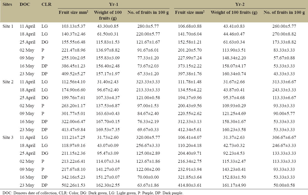 In both the years, the fruit size between initial to the final collection was 103.13 ± 5.37 and 409.52 ± 5.27mm2 throughout collection change in fruit size was 306.39 mm2, and the seed size between initial to the final collection was 0.81 ± 0.04 and 3.00 ± 0.04 throughout collection change in seed size was 2.19 mm2 at (S1). The fruit size between initial to the final collection was 111.78 ± 1.48 and 413.47 ± 9.84 mm2 over the period of collection change in fruit size was 301.69 mm2, and seed size between initial to the final collection was 0.60 ± 0.03 and 2.79 ± 0.12 over the period of collection change in seed size was 2.19 mm2 at (S2). The fruit size between initial to final collection was 106.41 ± 4.07 and 502.26 ± 1.53 mm2 over the period of collection change in fruit size was 395.85 mm2 and seed size between initial to final collection was 1.00 ± 0.05 and 2.44 ± 0.04 over the period of collection change in seed size was 1.44 mm2 at (S3).