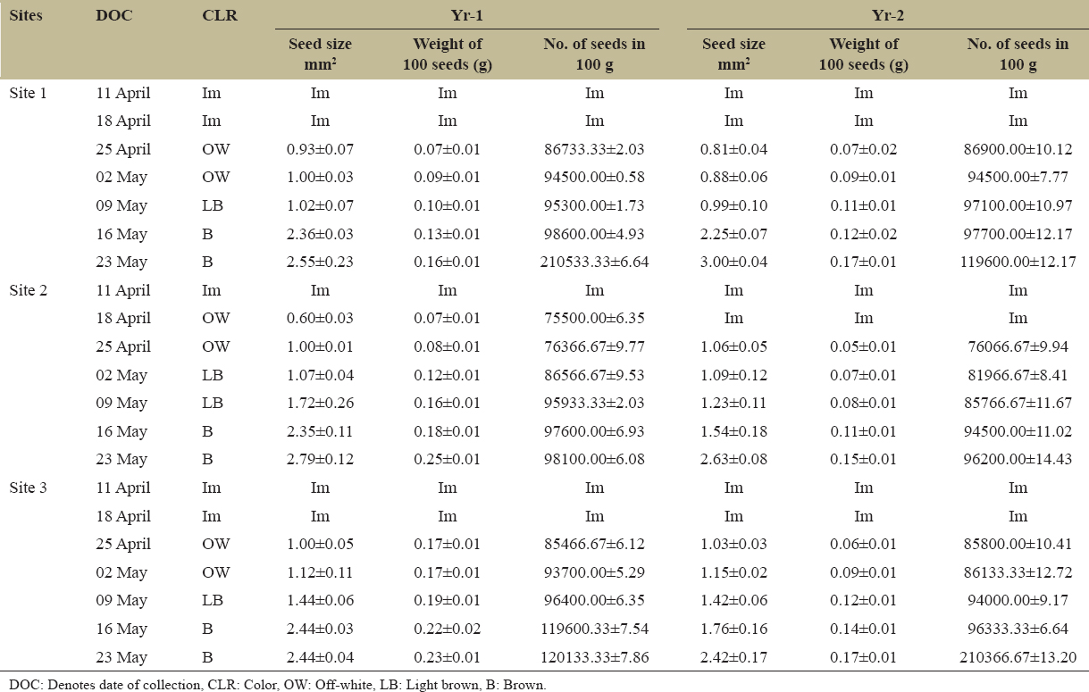 The color of the fruit in the first collection was light green in the 2nd week of April. The fruit turned dark purple at the final collection last May week [Table 2]. From initial to final collection, the fruit size ranged between 103.13 ± 5.37 (S1) and 502.26 ± 1.53 (S3) mm2 across all the sites. The seeds during the first two collections were extremely soft and immature. The mean seed size during the third collection ranged between 0.60 ± 0.03 (S2) and 1.06 ± 0.05 (S2) mm2 across all the sites.