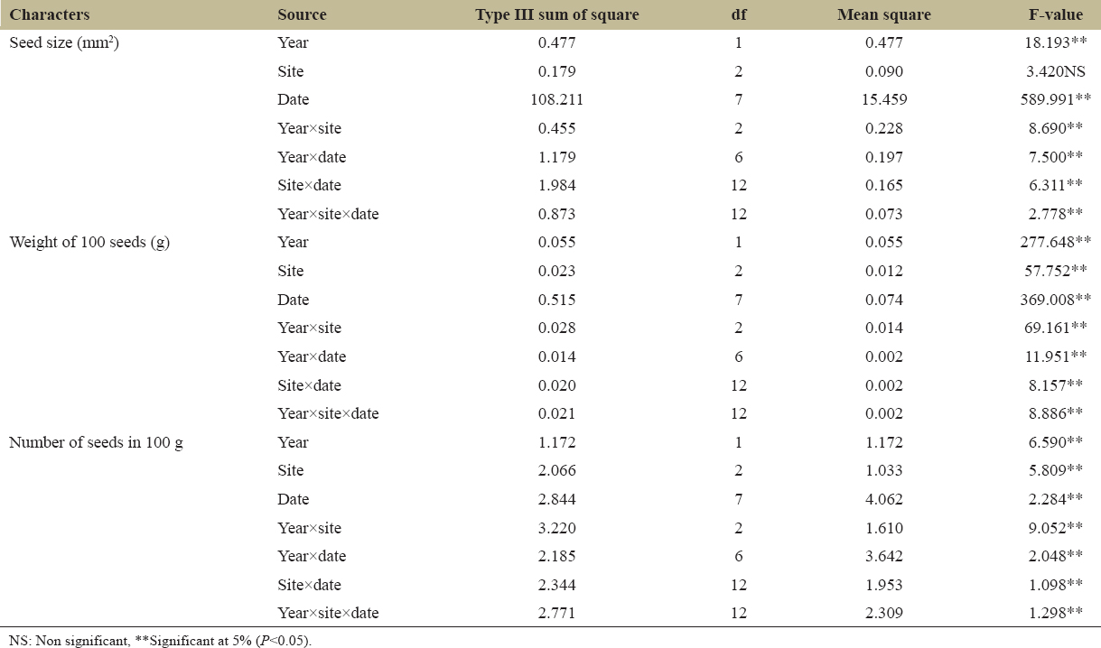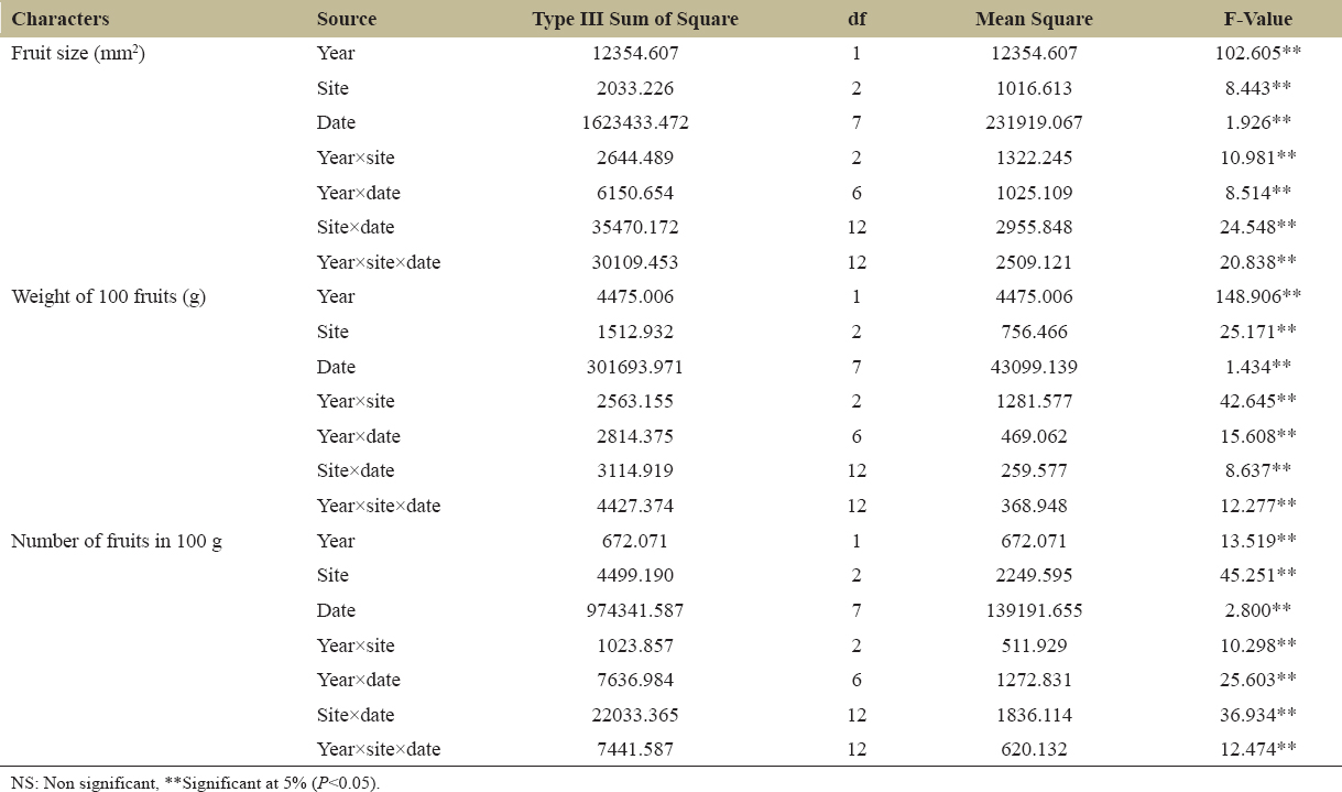Analysis of variance (ANOVA) showed that fruit size, weight of 100 fruits and number of fruits in 100 g varied significantly across years, sites and dates (P < 0.05). The interactions between year × site, year × date, site × date, and year × site × date were also significant for fruit size, weight of 100 fruits and number of fruits in 100 g. ANOVA showed that size, weight, and number of seeds in 100 g were significant across years and dates (P < 0.05). The interactions between year × site, year × date, site × date and year × site × date were significant for seed size, weight of 100 seeds, and number of seeds (P < 0.05) [Tables 4,5].