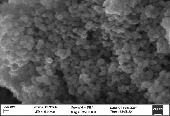 The FE-SEM, as shown in [Figure 1], produced pure Y2O3 nanoparticles using SA extract. The Y2O3 nanoparticles are spherical in shape and have the additive nature of secondary particles, each of which is composed of a cluster of primary particles and partially agglomerated. The obtained particles had a uniform shape and size, which was confirmed by the FE-SEM. The Y2O3 nanoparticles exhibit gatherings due to the dipole interaction of every particle. FE-SEM images of yttrium oxide nanoparticles show the formation of a spherical structure, which is found to have a mean approximate size of 150 ± 5 nm.