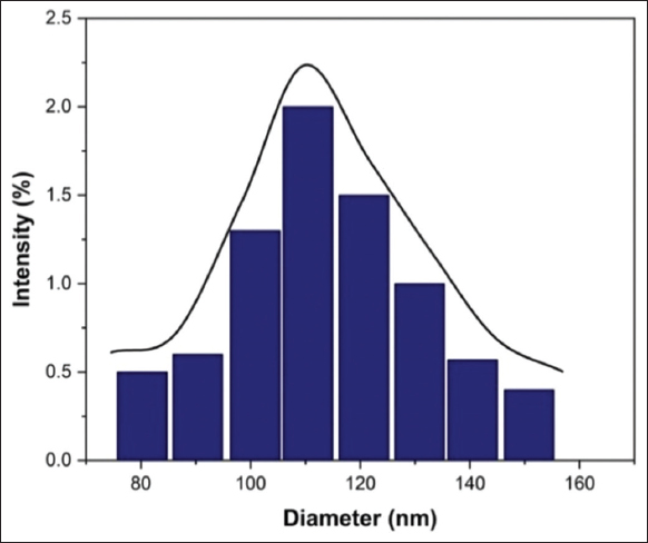 The DLS analysis revealed the average size of Y2O3 nanoparticles, which was found to be in the range of 110.4 ± 32 nm. According to the DLS measurements, which show a PDI value of 0.310, the size distribution of the nanoparticles is rather uniform, as shown in [Figure 2]. The production of agglomerated particles in the aqueous medium may be the cause of the increased particle size that was found by DLS, this phenomenon was documented in earlier studies [22]. DLS was primarily used to assess the hydrodynamic size of the Y2O3 nanoparticles that dissolved in cultured media. These nanoparticles were discovered to be approximately spherical, and throughout the experiment, they showed excellent monodispersity of the synthesized nanoparticles [21].