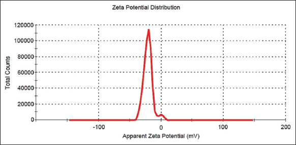 The surface charge of green synthesized Y2O3 nanoparticles was analyzed using Zeta potential (ζ), which has a negative charge of −19.2 mV, as shown in [Figure 3], with the capped phenolic compound being responsible for the negative surface charge [23].