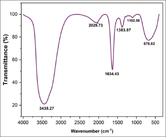 Peaks were observed in the FTIR spectrum analyses of Y2O3 nanoparticles at 3435, 2025,1634,1383,1102, and 676 cm-1, as shown in [Figure 4]. The broad spectrum of 3435 cm-1 indicates at O-H bend, particles in a solution [24]. The spectrum 2025 cm-1 responsible for the strong N=C=S stretching with isothiocyanate functional group. The 1102 cm-1 spectrum is responsible for the strong ether bond with C-O stretching.The sharp peak observed at 1634 cm-1 suggested that OH stretching was taking place in the residual moisture [25]. 1383 cm-1, which is responsible for the O-H bend, denotes phenol or tertiary alcohol. Y-O stretching in Y2O3 nanoparticles is responsible for the formation of the bands in the spectrum at around 676 cm-1. The peaks in the FTIR spectrum of synthesized Y2O3 nanoparticles that range between 500 cm-1 and 800 cm-1 in the previous study can be attributed to the stretching of Y-O molecules that resulted the synthesis of Y2O3 nanoparticles from the Y2O3 [11,26].