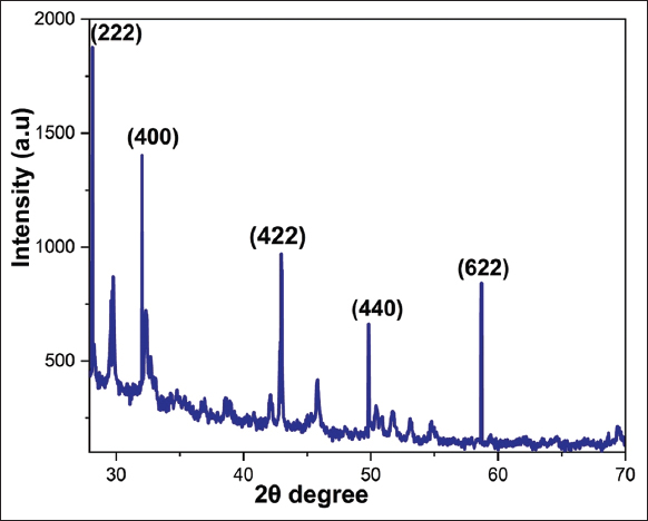 The XRD patterns of the Y2O3 nanoparticles, as shown in [Figure 5], depict the crystallized nature of the nanoparticles. This was due to the crystal growth under the lower bath temperature and the accompanied intercalation of nitrate ions from yttrium nitrate. The sample was observed to turn out to be amorphous, and the amorphous nature of the pure sample is shown by a broad hump and the appearance of diffraction peaks. Perhaps this would indicate that the generated Y2O3 nanoparticles have the same body-centered cubic shape as the standard Y2O3 nanoparticles (JCPDF Number 41-1105). The planes of XRD spectra revealed that the prepared Y2O3 nanoparticles were pure due to the sharp 2θ peaks at 28.1, 33.0°, 43.0°, 49.9°, and 58.8° responsible for the corresponding planes such as 222, 400, 422, 440, and 622. Due to the lingering effects of these other impurities, the XRD data only revealed weak peaks as minor peaks [21].