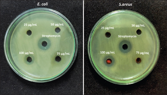 Antibacterial activity by the well-diffusion method of Y2O3 nanoparticles was examined against Escherichia coli and Staphylococcus aureus. The plate was pored with Muller–Hinton agar, bacterial suspension was coated uniformly, and then plates were punctured using gel puncture to form wells with a 6 mm diameter. On each well, different concentration of Y2O3 nanoparticles (25 μg/mL–100 μg/mL) and Streptomycin (HiMedia, India) as positive control (10 μg/mL) and negative control has been used 50 mL autoclaved double distilled water. After that incubating the cultures at 37°C for 24 h, the zone of inhibition (ZOI) was determined by measuring the diameter of the wells (mm) [19].