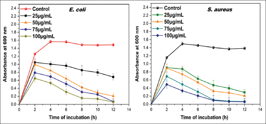 | Figure 7: Growth curve of Escherichia coli and Staphylococcus aureus under Y2O3 nanoparticles treatment. [Click here to view] |