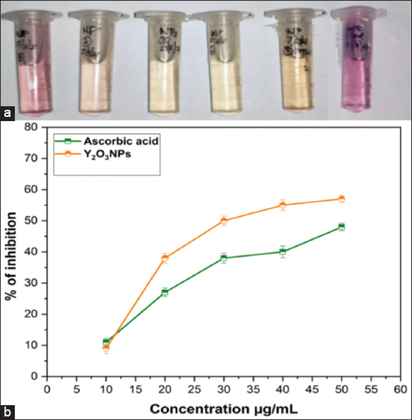 | Figure 8: Antioxidant activity of Y2O3 nanoparticles by DPPH method (a) observation of color changes after incubation period and (b) percentage of free radical scavenging activity. [Click here to view] |