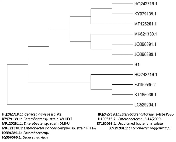 | Figure 1: Phylogenetic tree of isolate Enterobacter CU2004 (B1) using Neighbor Joining method by MEGA X. [Click here to view] |