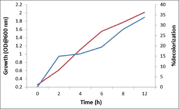 | Figure 2: Growth kinetics of isolate Enterobacter CU2004 (Time vs. growth and percentage of dye degradation). [Click here to view] |