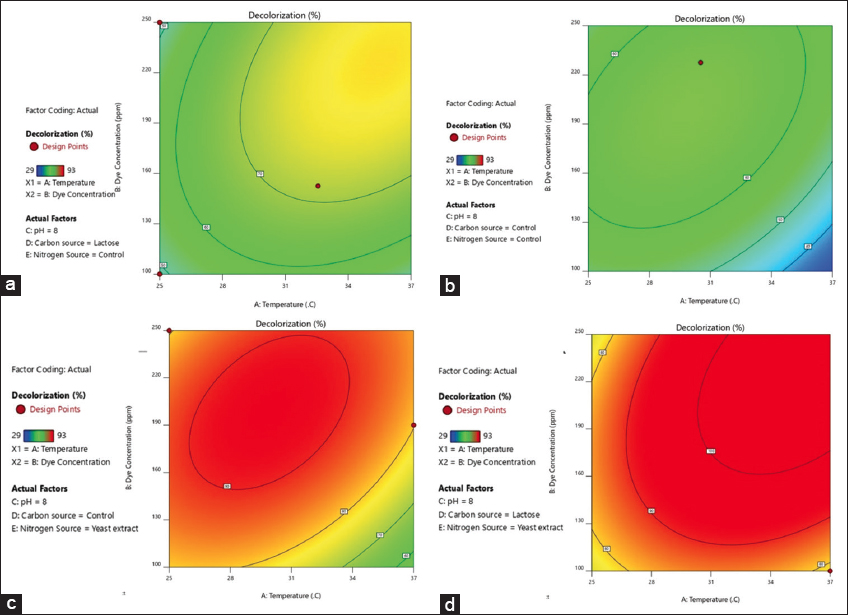 Comparative two-dimensional contour plots [Figure 4] comprising the global range (29–93%) of the response (% degradation of dye) aided in the selection of the other terms (D-Control/Lactose, E-Control/Yeast extract, and pH), along with the interaction term (AB). The result of the comparative contour plots indicated the higher decolorization rate in the lactose and yeast extract conditions when compared with the control at pH 8.