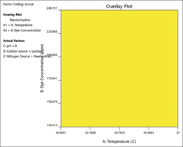In this optimization experiment, we attempted to establish design space considering a cutoff of minimum 90% decolorization response and covering a maximum range of input parameters to achieve the response target. As shown in the Figure 5, design space parameters for the ≥90% degradation was established as 30–37°C temperature, 133–249 ppm dye concentration, lactose as carbon source, and yeast extract as nitrogen source, with the pH to be maintained at 8.