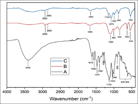 FTIR spectrum of parental dye (A) was compared with dye metabolites obtained at two different time intervals 24 h (B) and 72 h (C) Figure 6. The peaks of A at functional group region of FTIR shows peaks for O-H stretching found at 3400 cm-1. The range of 1600–1500 cm-1 shows the presence of alkene C=C stretching. Then, the peaks can be seen in the fingerprint region giving us clear indication of the functional groups. Range from 1500 to 1200 cm-1 shows aromatic C-C stretching, alkane C-H bending, and rocking. Range from 1200 to 1000 cm-1 shows alkane C-H wagging and aliphatic amine C-N stretching. Range from 1000 to 500 shows alkene C-H bending. Focusing on the spectrum of B, there are new peak formations and few peak deletions. The main peak deletion occurred at 3400 which was the O-H stretching peak. New peaks formed at 2900–2700 cm-1 range shows aromatic C-H stretching and alkane C-H stretching. The peak at 11640 cm-1 indicates the presence of alkene C=C stretching. The peak at 1100 shows the presence of aliphatic amine C-N stretching. The peak at 830 cm-1 shows the presence of ring C-C stretching and CH2 rocking. Range from 600 to 400 cm-1 shows the presence of ring C-C vibrations and alkane C-H bending. The spectrum of C has all the peaks similar to spectrum B except for a new peak at 1150 showing the presence of aliphatic C-N stretching and a missing peak at 620 cm-1. This shows that after degradation, there is a change in the molecular chemistry of the parental dye which is evident from the FTIR comparison spectrum [48,49].