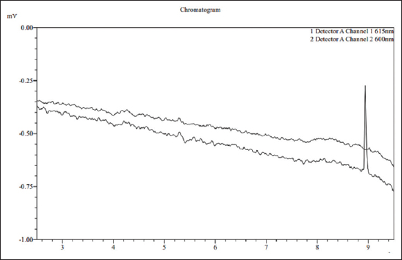 | Figure 7: HPLC chromatogram showing prominent single peak for Reactive blue 222 at 615 nm. [Click here to view] |