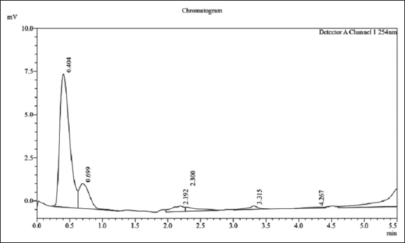 HPLC studies of the dye intermediates and the parental dye were compared with respect to their UV-Visible absorbance and retention time. Parental dye RB222 being chromogenic substance showed single peak with absorbance peak at 615 nm [Figure 7]. Microbial degraded RB222 was colorless and did not show any peak in the visible range while multiple new peaks with different retention time was observed at 254 nm [Figure 8]. This clearly states that parental dye was degraded by the isolate to different non-chromogenic metabolites [50].