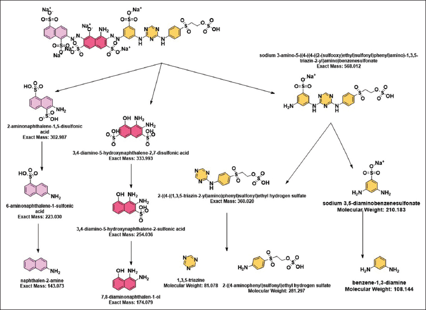 GCMS analysis of dye metabolites revealed multiple peaks obtained due to fragmentation of parental dye. The compounds and its structures were determined based on (m/z) values and its biodegradation pathway was proposed [Figures 9 and 10]. High molecular weight parental dye was degraded by Enterobacter CU2004 to lower molecular weight intermediates compounds. Initially the diazo dye undergoes asymmetric oxidative cleavage to 2-aminonapthalene-1,5-disulfonic acid(mol wt: 302.987), 3.4-diamino-5-hydroxynaphthalene-2.7- disulfonic acid (mol wt:333.993), and sodium 3 amino-5-((4-((4- ((2-(sulfooxy)ethyl)sulfonyl)phenyl)amino)-1,3,5-triazin-2-yl) phenyl)amino)benzenesulphonate (mol.wt:568.012). These dye intermediates on desulfonation and N-H bond cleavage resulted intermediates 6-aminonapthalene-1,5-disulfonic acid (mol wt: 302.987), 3.4-diamino-5-hydroxynaphthalene-2,7-disulfonic acid (mol wt: 333.993), and 2-((4-((1,3,5-triazin-2-yl)amino)phenyl)sulfonyl)ethyl hydrogen sulfate(mol.wt: 360.020) and sodium 3,5-diaminobenzenesulfonate (mol wt: 210.183). Fragmentation of the intermediates progress with desulfonation, N-H bond cleave and opening of rings to form 6-aminonapthalene-1-sulfonic acid(mol wt: 223.030), 3,4-diamino-5-hydroxynapthalene-2-sulfonic acid(mol wt: 254.036), 1,3,5-triazine(mol wt: 81.078), and 2-((4-aminophenyl)sulfonyl)ethyl hydrogen sulphate (mol wt: 281.297). These intermediates further fragmented to napthalen-2 amine(mol wt: 143.073), 7,8-diaminonaphthalen-1-ol(mol wt: 174.079), 1,3,5, triazine (mol wt: 81.078), 2-((4-aminophenyl)sulfonyl)ethyl hydrogen sulfate (mol wt: 281.297), and benzene-1,3-diamine(mol.wt 108.144). sequential reactions of deamination and dihydroxylation can fragment the compounds to smaller compounds like benzene, naphthalene enters gentisic acid pathway channelised to TCA cycle to completely mineralize the dye [51].
