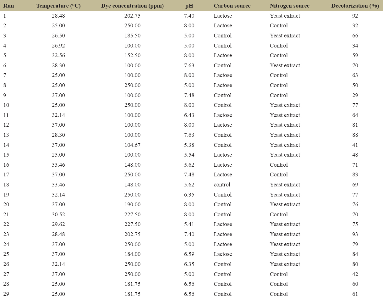 | Run | Temperature (°C) | Dye concentration (ppm) | pH | Carbon source | Nitrogen source | Decolorization (%) |