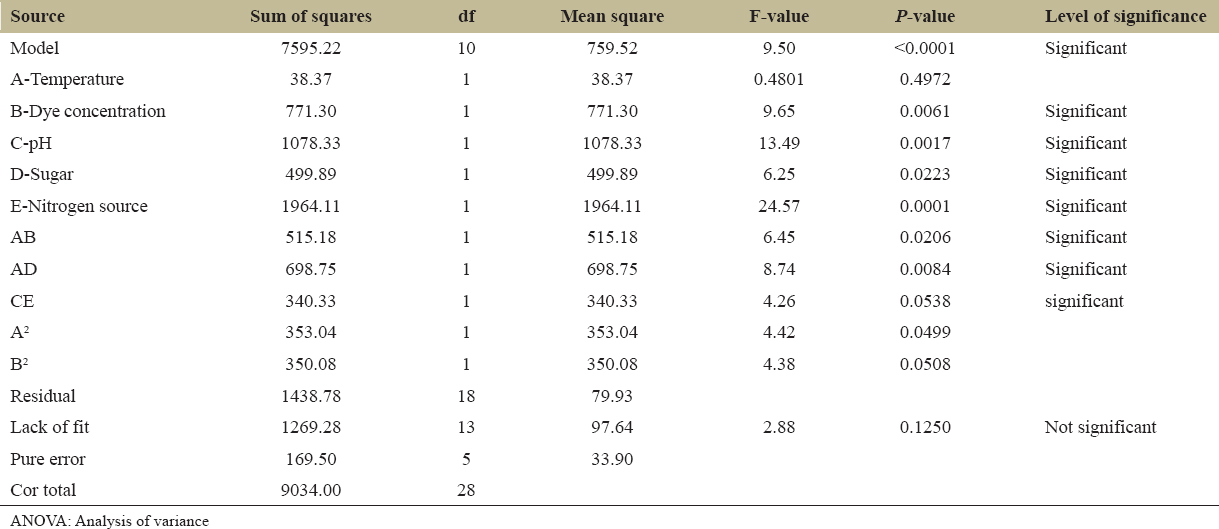 The model F-value of 9.50 as determined by ANOVA implied that the model selected was statistically significant (P < 0.00001). There was only a 0.01% chance that an F-value this large could occur due to noise. The Lack of Fit F-value of 2.88 implied that it was not statistically significant relative to the pure error. There was a 12.50% chance that a lack of fit F-value this large could occur due to noise. Finally, the lack of fit was statistically insignificant (P = 0.1250). Based on this statistical analysis, a reduced quadratic model was selected. Model terms, namely, dye concentration (B), pH (C), carbon (D), and nitrogen (E) sources independently and, interactions of temperature X dye concentration (AB) and temperature X sugar (AD) were found statistically significant [Table 2]. Temperature X dye concentration (AB) was selected as interaction partners for further evaluation. The empirical relation between % degradation and factors was formed as: %degradation = 74.34 + 1.51A + 6.51B + 8.24C + 4.23D + 8.61E + 6.82AB + 6.68AD + 4.63CE + −8.48A2–8.57B2.