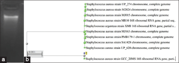 Molecular identification of the isolated osmotolerant bacteria (B-6 and B-7) was performed by PCR amplification of 16SrRNA sequences. For this 16 S rRNA gene of both the isolates was amplified by PCR successfully, then the amplified products were checked with agarose gel electrophoresis [Figures 1a and 2a]. The results of the gel electrophoresis revealed that the size of the PCR-amplified products of both isolates was approximately 2500bp (2.5 kb). The amplified products were sequenced and the sequences were generated in FASTA format. These resultant sequences were compared with the NCBI nucleotide database using BLAST-N comparison. The BLAST-N comparison study revealed 100% similarity of the isolate B-6 with Staphylococcus aureus strain GCC_20MS (NCBI accession number MZ305087.1) and 97.85% similarity of the isolate B-7 with Staphylococcus xylosus strain AT13 (NCBI accession number MW175729.1). The determined 16S rRNA sequences of both the isolates (B-6 and B-7) were submitted to the database of NCBI, GeneBank under the accession numbers (OM993290) (OM860203), respectively. The phylogenetic tree study of the isolated osmotolerant bacteria (B-6 and B-7) was performed and the data are shown in [Figures 1b and 2b].