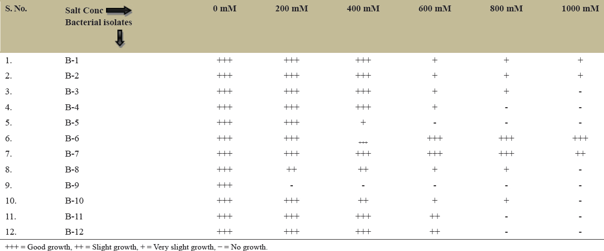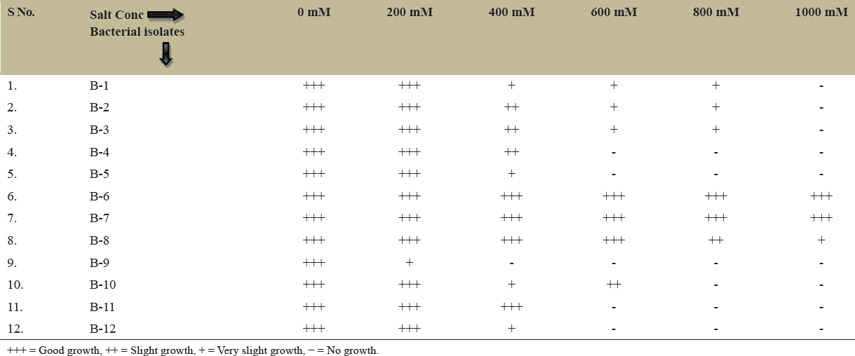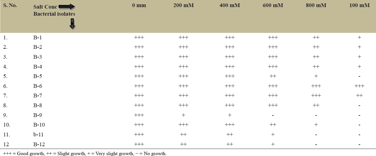 Table 1: The study of the osmotolerance potential of the bacterial isolates (B-1 to B-12) using various concentrations of NaCl (200 mM, 400 mM, 600 mM, 800 mM, and 1000 mM).