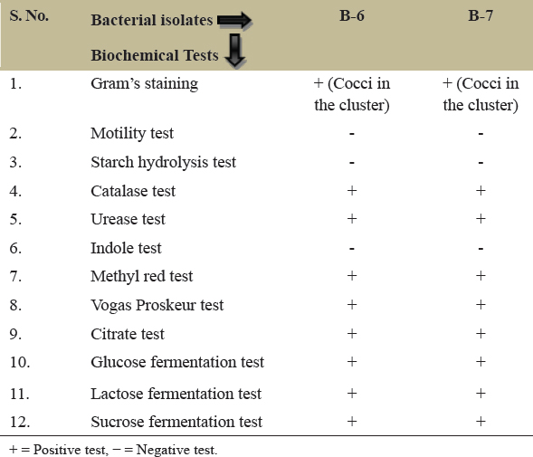 In the present study, the preliminary characterization of the two salt-tolerant bacterial isolates (B-6 and B-7) was done by morphological and various biochemical tests. Both isolates were chosen for Gram’s staining to evaluate their morphological or microscopic characteristics. In the results of this study, both the salt-tolerant bacteria (B-6 and B-7) were found Gram’s positive, round (cocci) in shape, and arranged in grapes-like clusters. Zinniel et al. (2002) also found the presence of Gram-positive endophytic bacteria in agronomic crop plants [41]. In the present study, these Gram-positive cocci were further characterized by various biochemical tests. The results of the biochemical test revealed that both the isolated salt-tolerant bacteria (B-6 and B-7) were shown negative tests for motility and indole tests and positive tests for MR, VP, citrate utilization, nitrate reduction, sugar fermentation tests (for glucose, lactose, and sucrose), catalase, and amylase [42]. In this study, both the salt-tolerant bacterial isolates were shown morphological and biochemical properties of Streptococcus Sps based on Bergey’s manual studies [43].