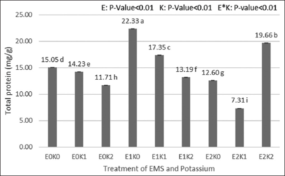 Our result showed that the treatment with 0.3% EMS and 0 grams of potassium produced the highest production of total dissolved protein, with a yield of 22.33 mg/g. The highest total dissolved protein yield was further shown in the treatment using 0.5% EMS and 5 g of potassium with a yield of 19.66 mg/g. The treatment using 0.5% EMS and 0.25 g of potassium showed the lowest total dissolved protein yield of 7.31 mg/g. In light of the findings of the [42] experiment, demonstrating that EMS treatment increased the protein and oil content of soybean seeds. Meanwhile, according to [43] the 0.3% EMS treatment on mulberry plants showed the highest protein content compared to the 0.1% EMS treatment and controls.