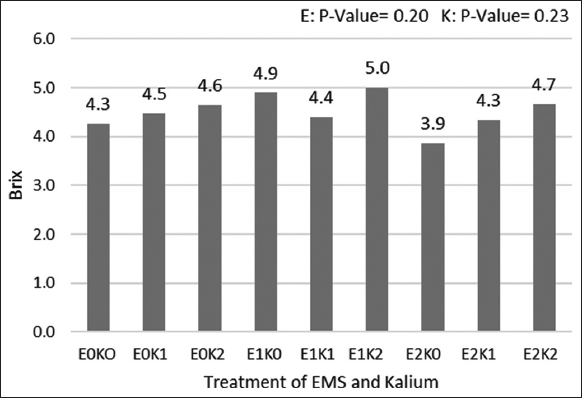 The recent study’s findings also showed that Brix value was also measured to determine EMS combined with potassium treatment to tomatoes [Figure 4]. The result showed that 0.3% EMS combined with 5 g of potassium had the highest Brix value (5.0oBrix) and the treatment using 0.5% EMS combined without potassium had the lowest Brix value (3.9oBrix). The maximum Brix value was obtained with EMS treatment at doses of 0.3% without the addition of potassium fertilizer (4.9oBrix). The addition of potassium up to a dose of 5 g in plants mutated with 0.3% and 0.5% EMS tended to increase the brix value of tomatoes. The addition of potassium had a greater effect on the variable value of brix or total dissolved solids (TSS) and gave a significant response [50]. The increase in sugar proved the significance of potassium on the process of biosynthesis and transfer of sugars throughout the plant body [51].