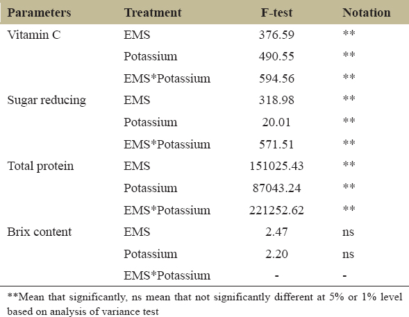 Based on the findings obtained from the analysis of variance, parameters of vitamin C levels were significantly affected by the EMS and potassium treatments, reducing sugars, and total dissolved protein at a significance level of 1%. Each treatment using potassium and EMS showed a different significant effect according to the findings of analysis of variance. EMS and potassium treatment and the mutual interaction showed a significant effect on the parameters of vitamin C, reducing sugars, and total dissolved protein. The EMS and potassium treatments alone showed no significant effect on the Brix value parameter. The F value of the results of the analysis of variance for each treatment of the observation parameters is displayed in Table 1.