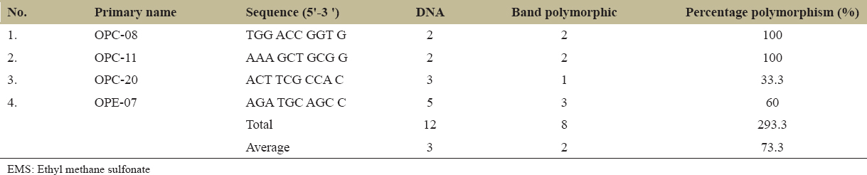 Table 2: The percentage of polymorphisms and the quantity of DNA bands and in tomato plants treated using EMS.